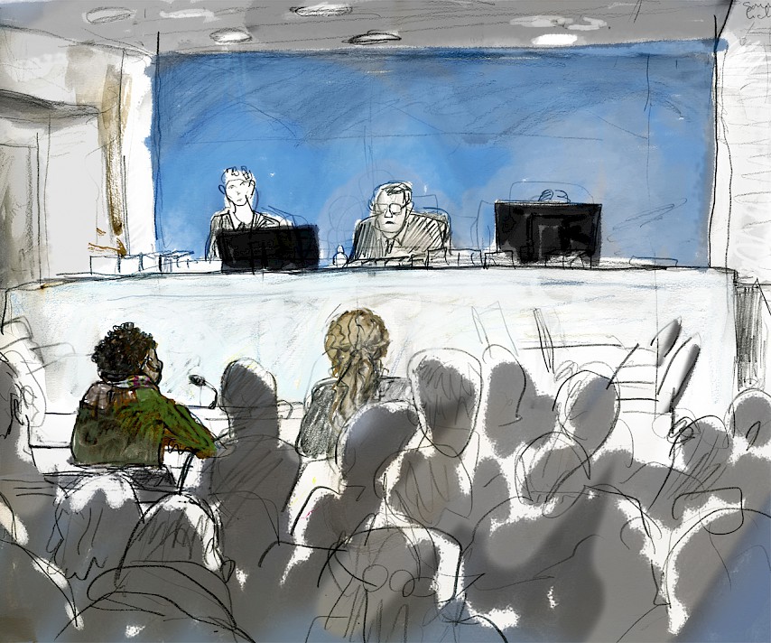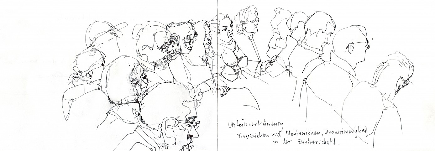 Eine Prozessbeobachtung beginnt bereits vor Verhandlungsbeginn, beim Warten, vor dem Gerichtsraum, beim Einlass. Uns interessiert, wer anwesend ist, die Stimmung und die Reaktionen von Seiten der Besucher_innen, möglichen Unterstützer_innen und den Angestellten des Gerichts. Zudem notieren wir verbales und nonverbales Handeln und unsere eigenen Empfindungen.