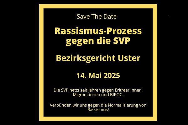 Am 14. Mai steht die SVP wegen rassistischer Hetze vor Gericht. Seit Jahren verbreitet sie Hass gegen Eritreer:innen, Migrant:innen und BIPOC. Jetzt ist es Zeit, ein klares Zeichen zu setzen. Wir sagen Nein zur Normalisierung von Rassismus. Kommt vorbei, zeigt Präsenz & steht gemeinsam mit uns ein gegen rechte Hetze!